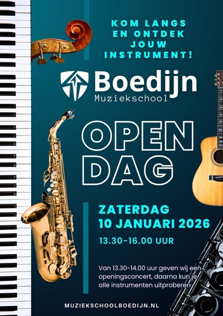 Er zijn ook optredens van leerlingen en bandjes, dus je kunt luisteren naar live muziek en ondertussen al je vragen stellen. Voor kinderen is er een leuke speurtocht met een kleine verrassing aan het eind. Buiten kun je een kijkje nemen in het Boedijn Plukbos.